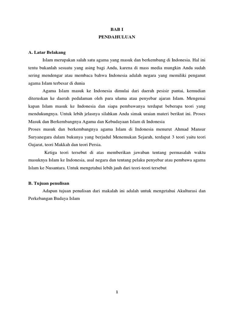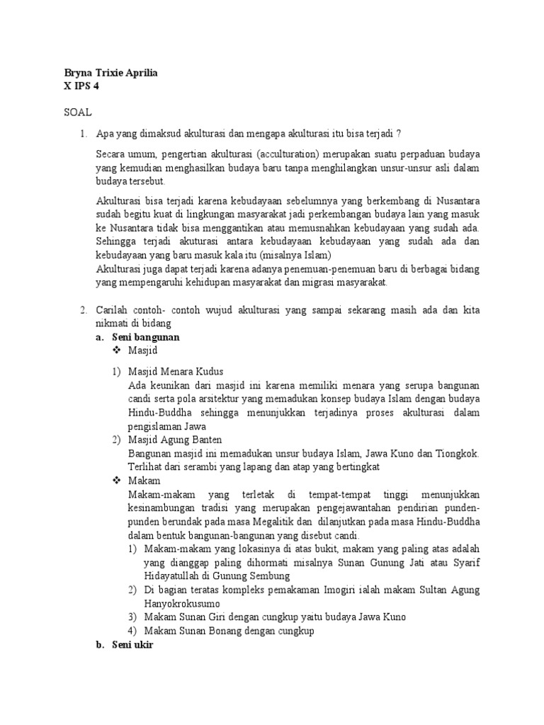 Akulturasi budaya indonesia dan islam akulturasi adalah percampuran dua atau lebih kebudayaan, tetapi unsurunsur pengaruh islam dalam kepemimpinan indonesia proses masuk dan berkembang nya agama dan kebudayaan islam di indonesia pada akhir abad. Akulturasi perkembangan budaya islam disusun oleh : Pada masa perkembangan islam di zaman madya , akulturasi dan perkembangan budaya islam di indonesia, berkembang ajaran bahwa seni ukir, patung, dan melukis makhluk hidup, apalagi manusia secara nyata, tidak diperbolehkan. Untuk memenuhi tugas dari mata pelajaran sejarah. Jawaban sesuai yang diamanatkan dalam permendiknas no 13.